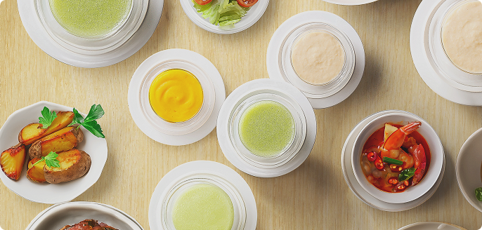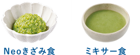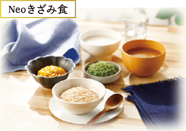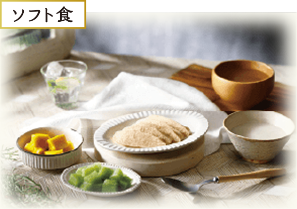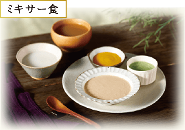 食材をやわらかく調理し、 硬い食材でもミキサーで粉砕し活用。 きざみ・ソフト・ミキサーの各形態に、 柔軟に対応。