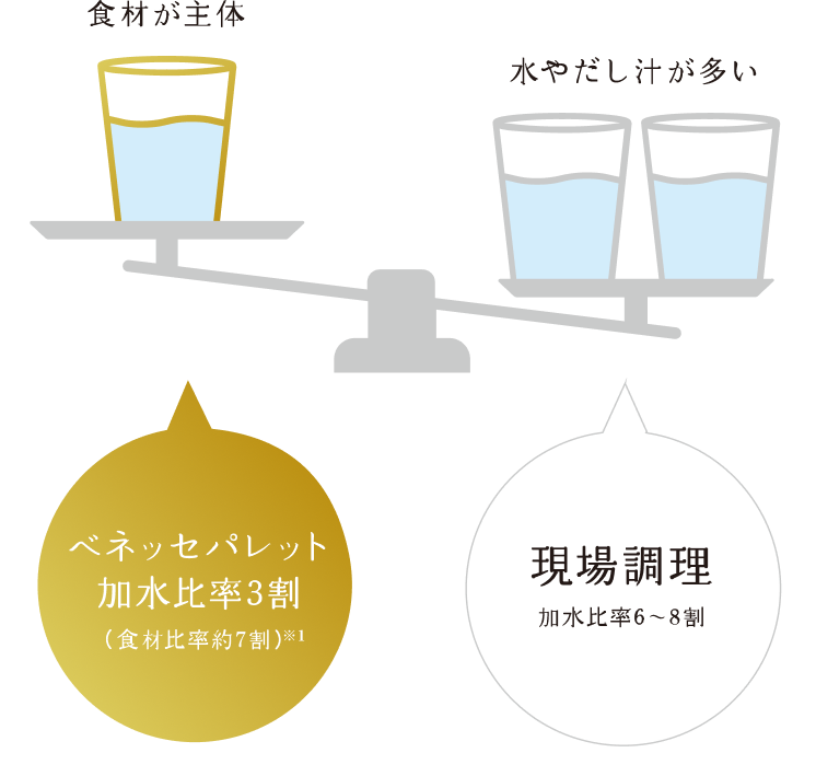 食材比率約7割※1。 最小限の加水量で、 食材本来の 栄養を摂取する。