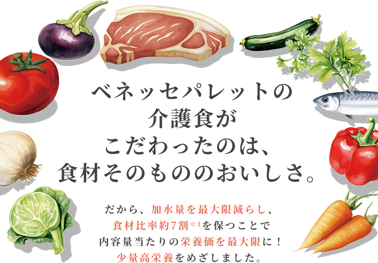 当社の介護食は、食材比率が約7割※1と高く、栄養価を最大限に上げるとともに、 食材の風味をできる限り薄めないことで、「おいしい介護食」をご提供しています。